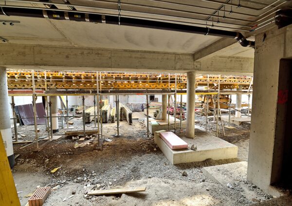 Trotzdem sind die Installationsarbeiten für Heizung und Sanitär wie auch die Elektroverlegearbeiten termingerecht begonnen worden. Dies ist im Foto 1 mit Blick von der Zufahrt in die Tiefgarage oben an der Decke zu sehen.