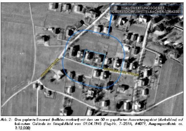 Der Luftangriff vom 27.04.1945 (vgl. Kap. 4.1) wird durch zwei Übersichtsbefliegungen auf Mikrofilm dokumentiert. Diese liefern keine Hinweise auf Sprengbombenabwürfe im geplanten Baugebiet. Jedoch resultieren aufgrund des ungünstigen Maßstabs der Befliegung sowie aufgrund des zeitlichen Abstands zum Angriffsereignis Erkenntnislücken. Für das Untersuchungsareal „Oberstdorf, Wittelsbacher Straße“ konnten nach Auswertung der verfügbaren Luftaufnahmen keine Hinweise auf Bombenabwürfe bzw. Einnahmekämpfe ermittelt werden. Damit war auch diese Hürde genommen, und die Maßnahmen zur Bodenverbesserung konnten vergeben werden.