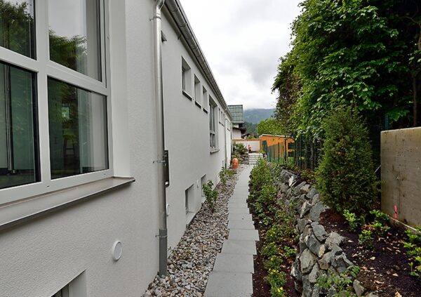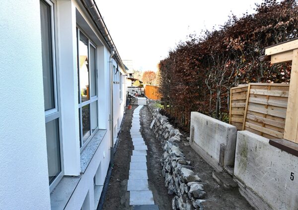 Das letzte Foto zeigt die Nordseite von Residenz 1 (links im Foto) und Residenz 2 (rechts im Foto) mit dem Zwischenverbindungsbau. Die Reihe L-Steine im Vordergrund markiert die Grenze zum Nachbarn.