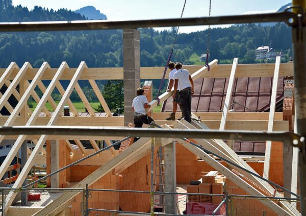 Diesmal hatten wir mit dem Wetter in Oberstdorf Glück. Wir brachten das Dach dicht ohne Regen, was sehr vorteilhaft war, da es Nacharbeiten, verursacht an den Sicht- Balken und -Holzschalung durch Wasserflecken in der oberen Dachgeschosswohnung, ersparte. Das obere Foto zeigt die Zimmermannsleute beim Dacheindecken.