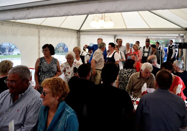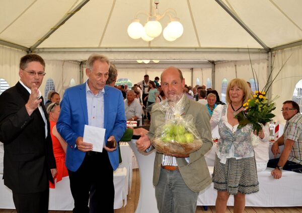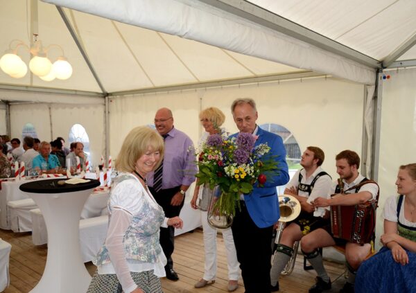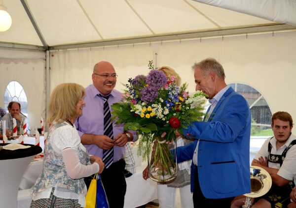 Mit nebenstehendem Programm hatten wir eingeladen: und über 100 Gäste kamen. Das Wetter spielte mit, so dass der Sektempfang draußen in gelockerter Atmosphäre stattfinden konnte. Die Gesamtorganisation lag in den Händen der „allgäu event agentur“. Und danach ging es dann in das Festzelt, um den formellen Teil zu absolvieren. Markt Oberstdorf war vertreten durch die Herren Speigl, Kaufmännischer Leiter, und Klein, EDV-Leiter, und nach dem Grußwort der Gemeinde, gehalten von Herrn Speigl, überreichte Herr Klein das Gastgeschenk der Gemeinde zur Einweihung. Im Foto fünf sind die Personen von links nach rechts: Herren Speigl, Krüger, Klein und Frau Krüger.