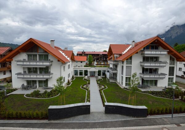 Die Bauarbeiten am Ferienwohnungsparadies Edelstein Suiten der Oberstdorfer Residenz sind abgeschlossen soweit man bei einem großen Bauvorhaben überhaupt von einem endgültigen Abschluss sprechen kann. Ausstehen noch einige dekorative Elemente wie die zwei Löwen aus Granit rechts und links des Haupteingangs der Residenz 1 + 2 sowie die Abdeckplatten der Eingangsmauereinfassungen und bei Residenz 3 fehlt noch der Löwe aus Marmor auf dem Sockel rechts des Eingangs.