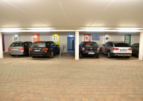Im Februar wurden die letzten Kleinigkeiten an der Residenz 1 + 2 fertiggestellt wie auch das Parkleitsystem der Tiefgarage. Die Parkplätze sind stirnseitig auf der Garagenwand mit einer Farbtafel versehen gemäß oberem Foto. Die Farbtafel ist in der zugehörigen Suitefarbe gehalten und zur weiteren Kennzeichnung ist darauf eine Glasplatte mit beschichteter Folie mit dem Suiten Namen und dem Konterfei des Suiten Namensgebers montiert.