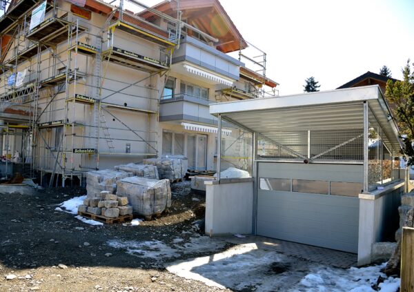 Nach dem Fertigstellen der Tiefgaragendecke wurde diese sofort als Lagerfläche für Baumaterialien genutzt und sorgte für etwas Entspannung bei den beengten Platzverhältnissen (siehe oberes Foto). Das Foto zeigt weiter, dass die Fenster inzwischen montiert wurden, und an den Fassaden der Vollwärmeschutz angebracht wurde. Im Hintergrund am Zwischenbau ist zu erkennen, dass auch das Eingangsportal Form annimmt. Auch die Zufahrt zur Tiefgarage wurde mit Betonfertigelementen erstellt, wie im letzten Bild zu sehen ist.