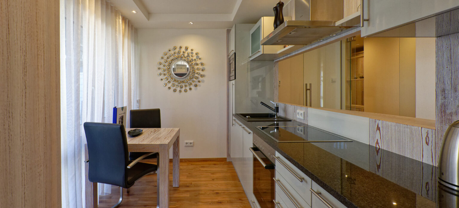 Die geschmackvoll eingerichtete Küche lädt ein zum gemeinsamen Kochen und Genießen. Zur hochwertigen Ausstattung gehören Spülmaschine, Mikrowelle sowie eine Kaffee- und Nespressomaschine.
